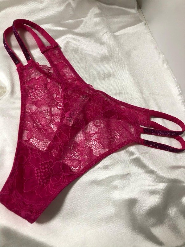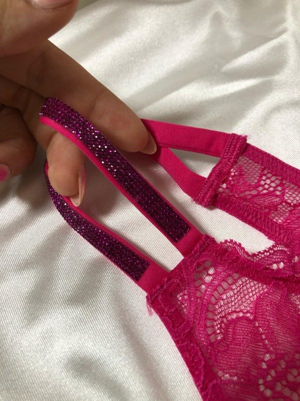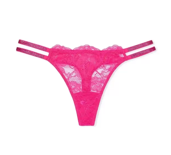 El elegante encaje floral se realza con tirantes laterales dobles que brillan con hileras de pedrería. Tiro bajo. Pierna alta. Tirantes dobles con pedrería. Panel de refuerzo de algodón. Espalda mínima. Parcialmente confeccionado con materiales reciclados. Lavado a máquina.